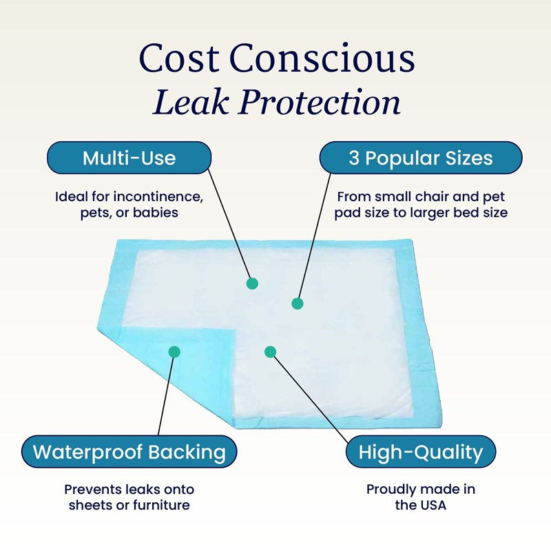 Flat absorbent pads that protect upholstery, sheets, wheelchairs and other surfaces. Available in washable and disposable styles in a variety of sizes.